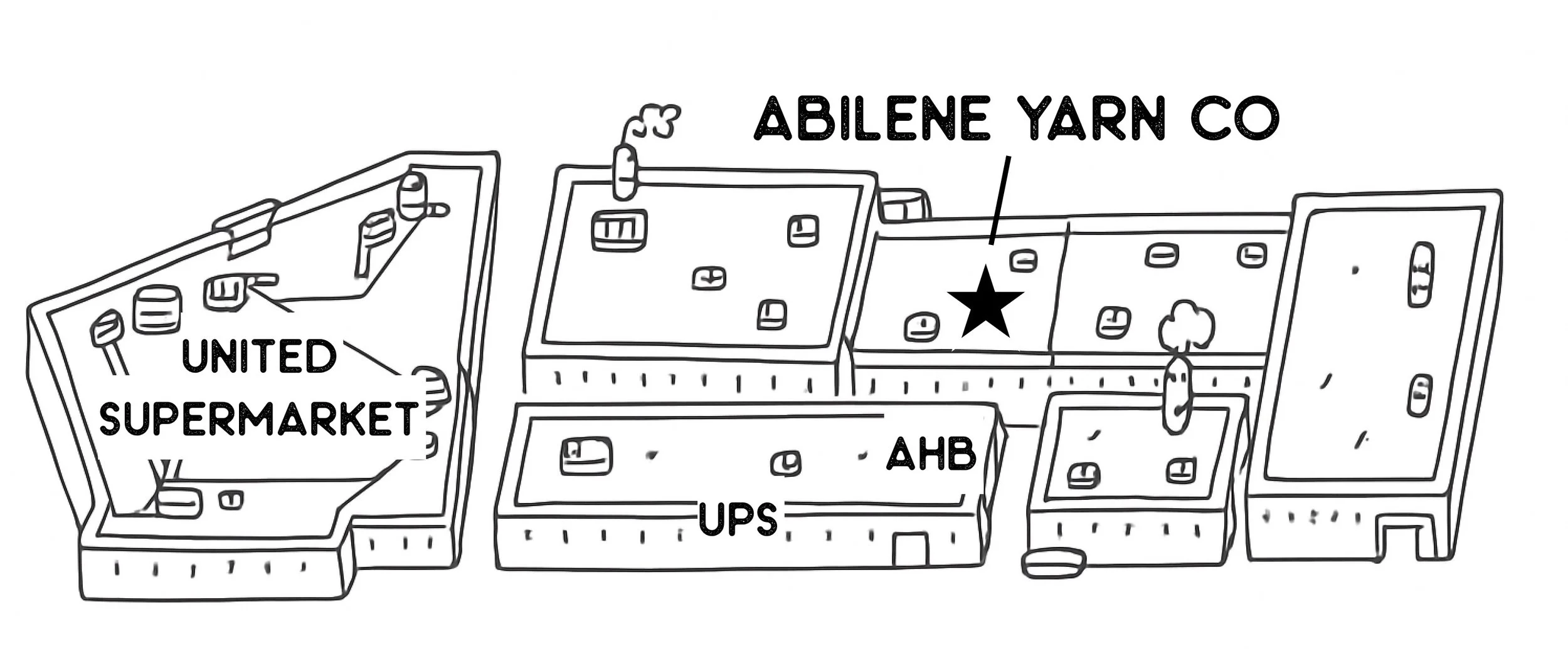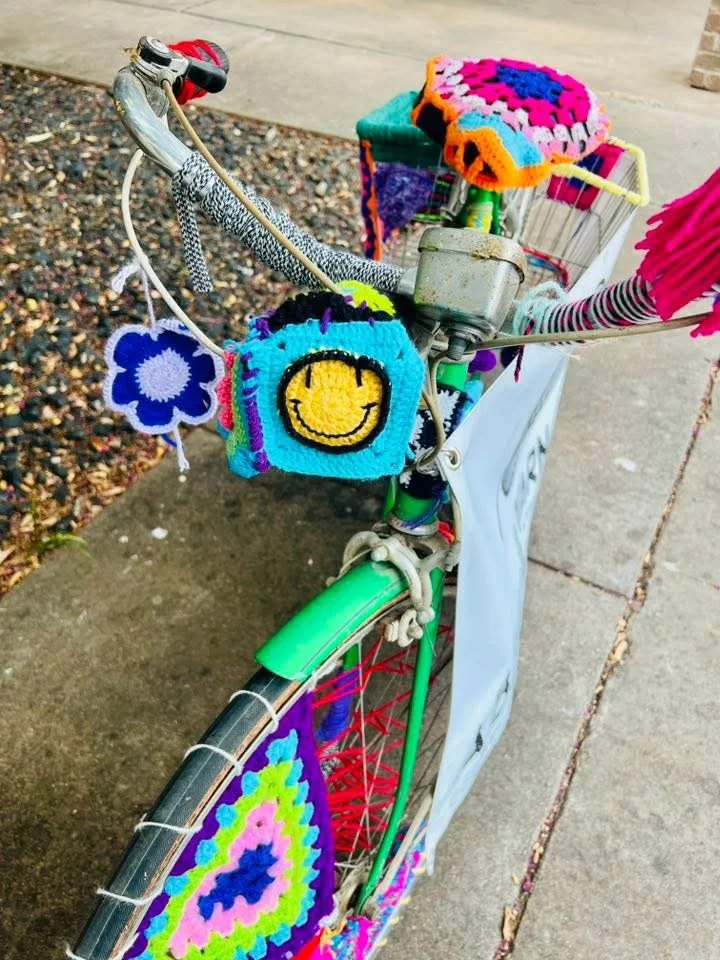 We are in the rear courtyard, behind American Honey Boutique. I recommend parking out front between AHB and The Perch, and looking for the yarn-wrapped bicycle as your first clue. Then, follow the yarn through the courtyard, turn left and go past Kenzie Davis Hair. You’ll see the yarn pompoms as soon as you turn the corner!