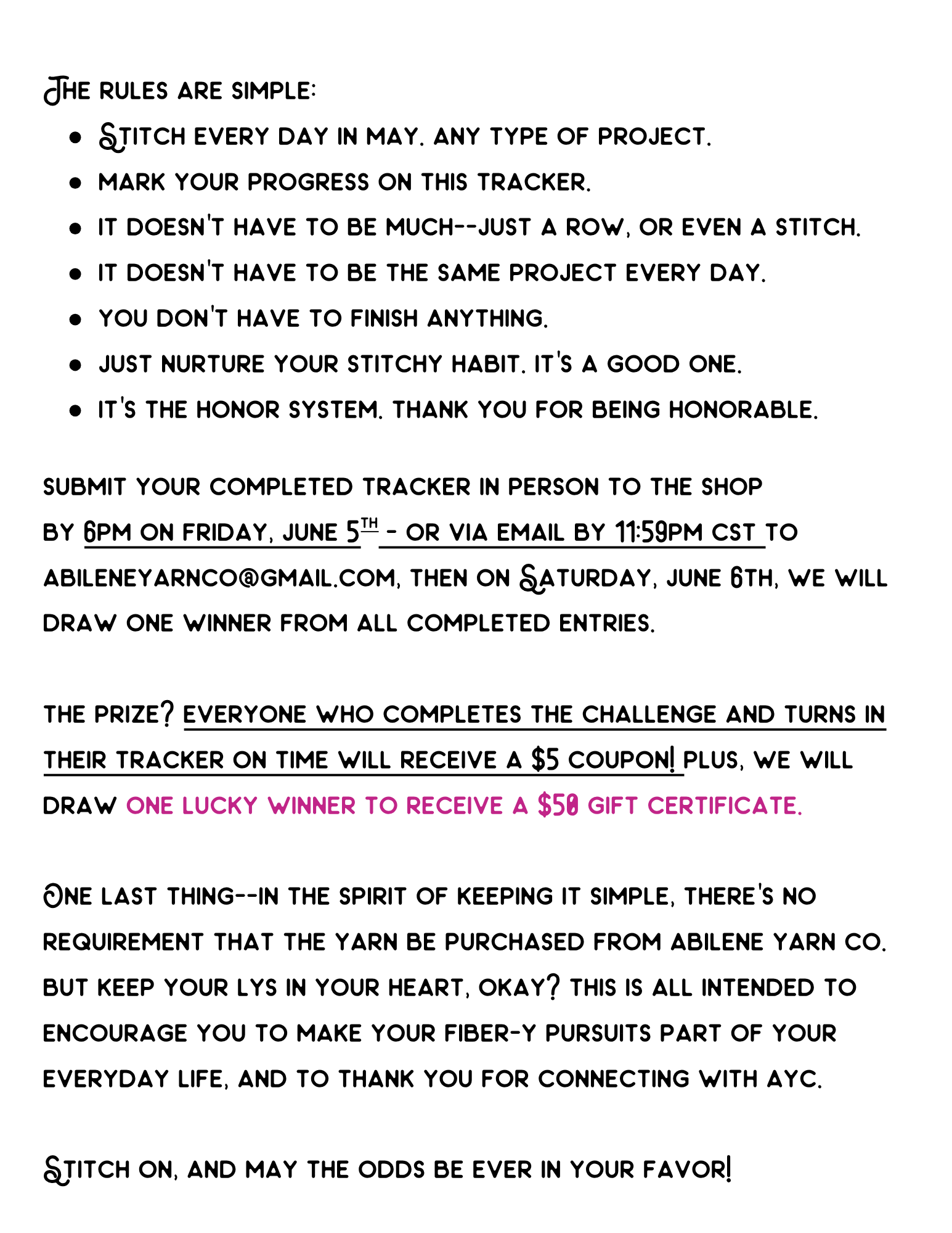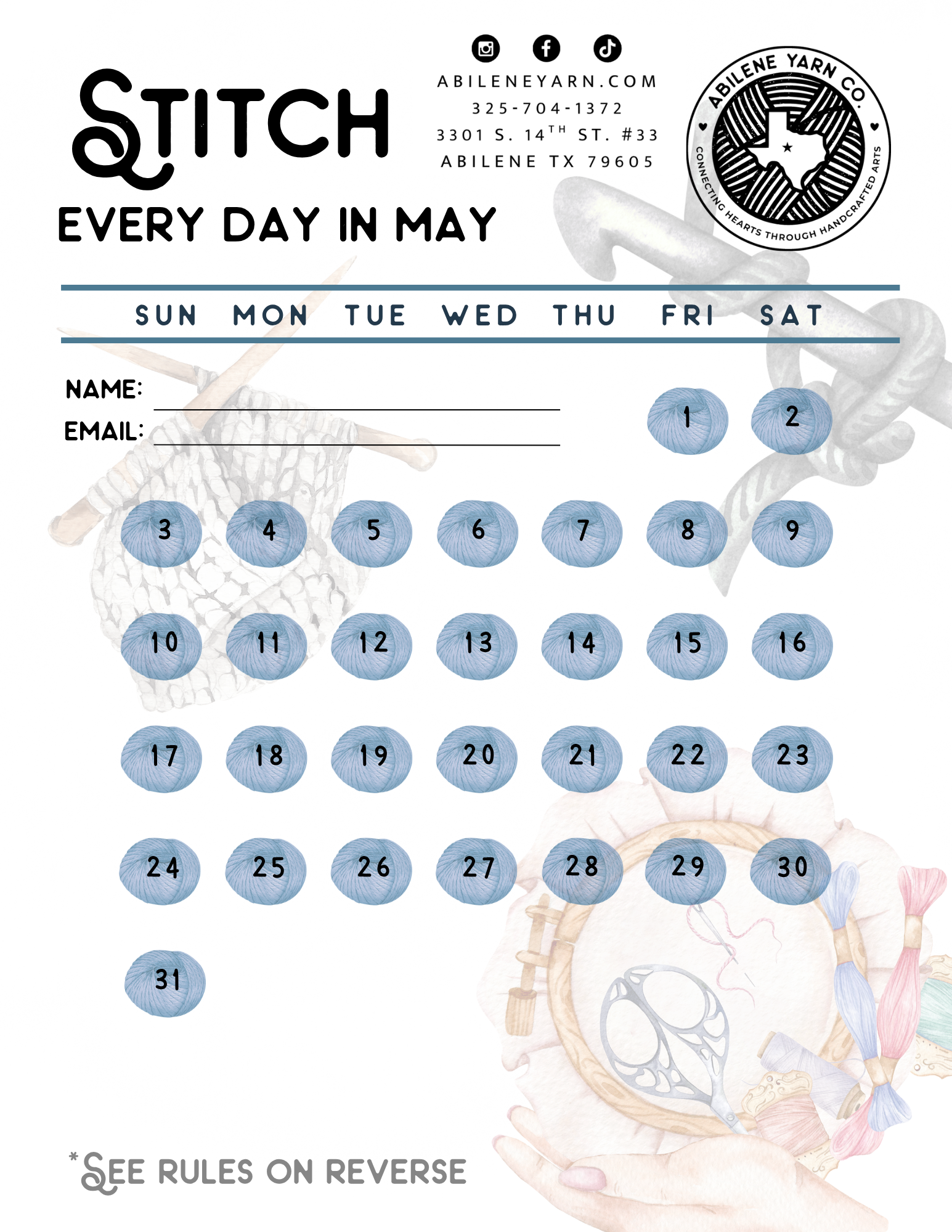 Save or print this tracker to keep track of your stitching during the month of May, and then turn it in to the shop by June 5th to be entered to win a $50 Gift Certificate!